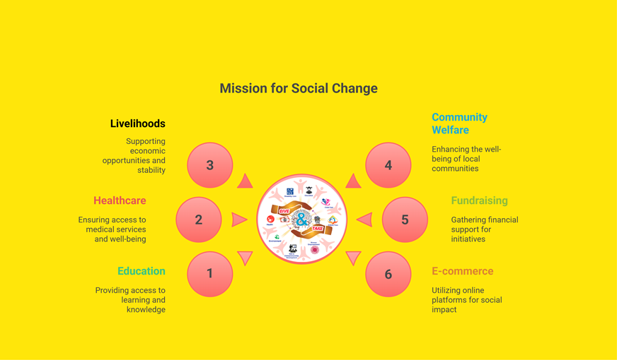 To mobilize resources for education, healthcare, livelihoods, and community welfare by integrating fundraising with e-commerce, ensuring that every customer purchase directly contributes to social change.